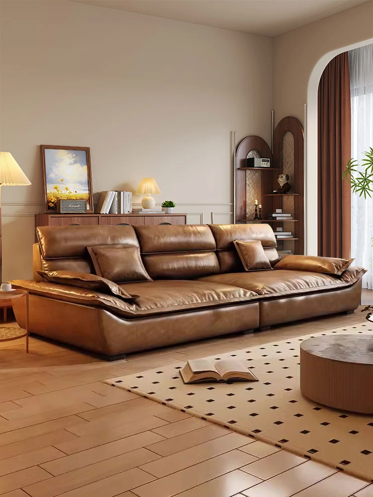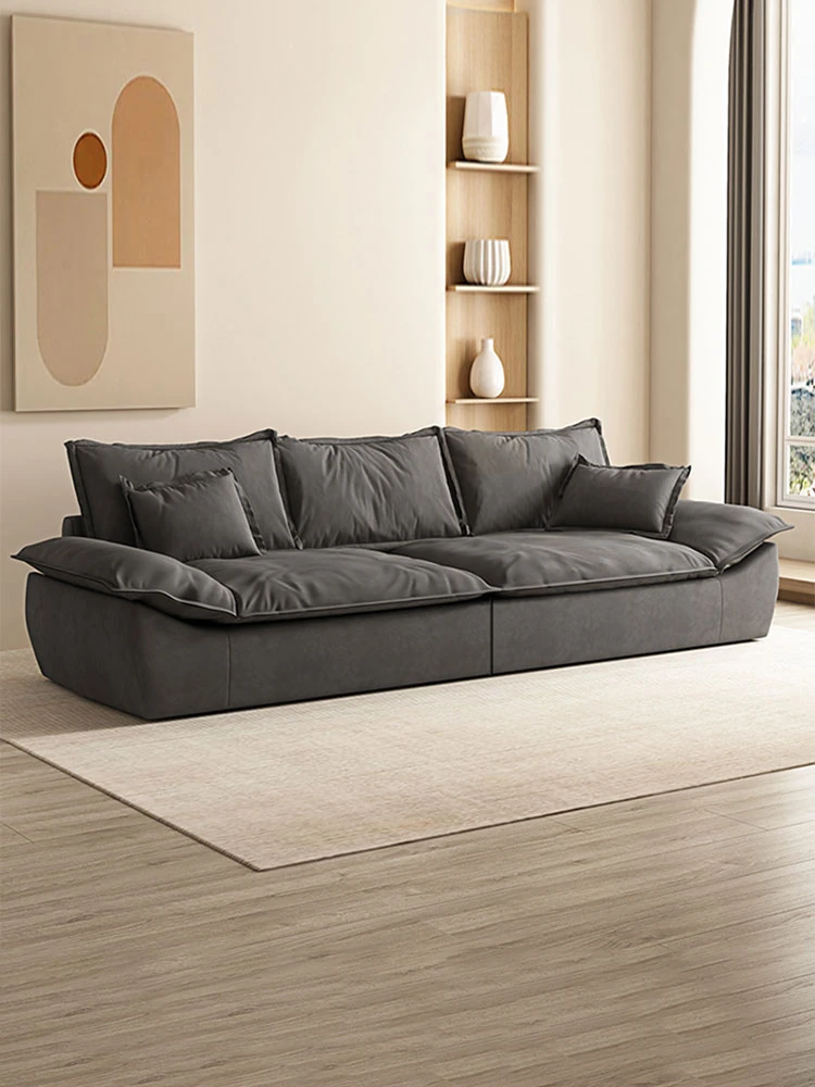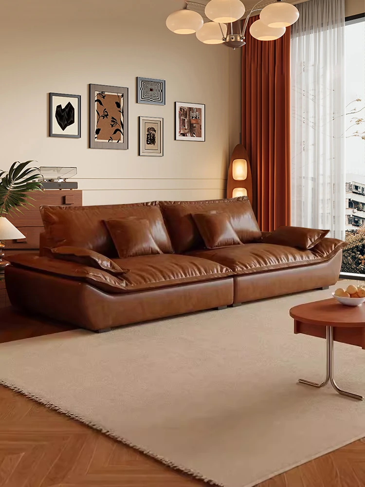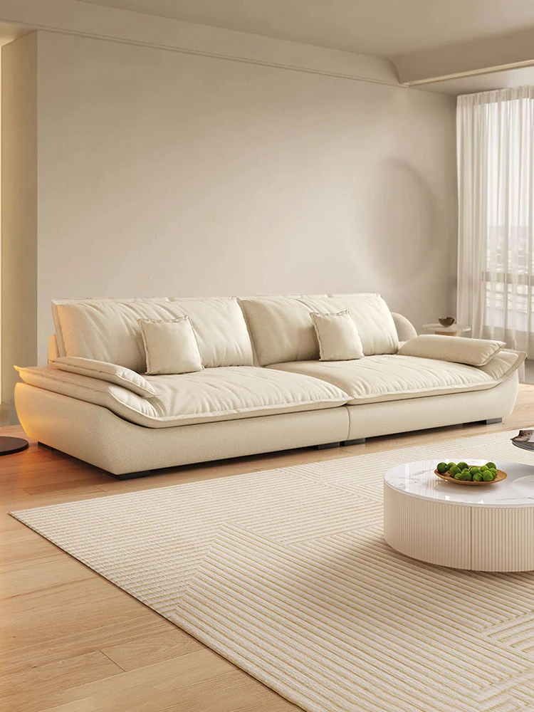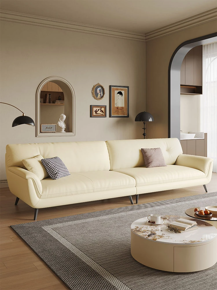 モダンシンプルなクリーム風キャットグラブ皮革ソファ | イタリアンラグジュアリー | リビングルームに最適な小型住宅用直置き皮革ソファ | 癒しの空間を演出し、スタイリッシュにあなたの生活をアップグレード!