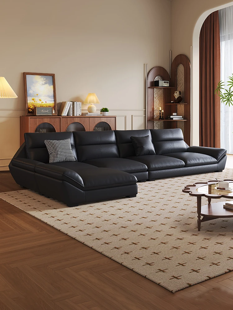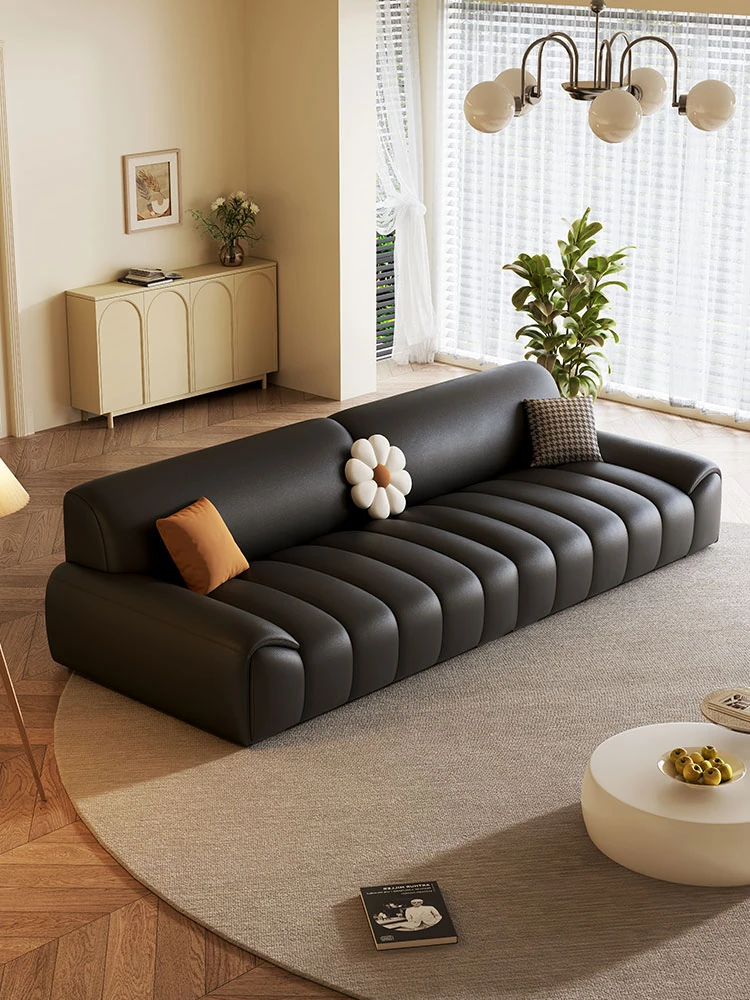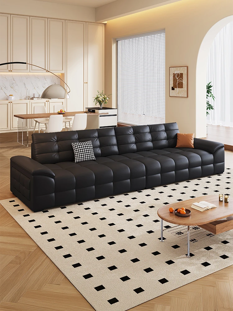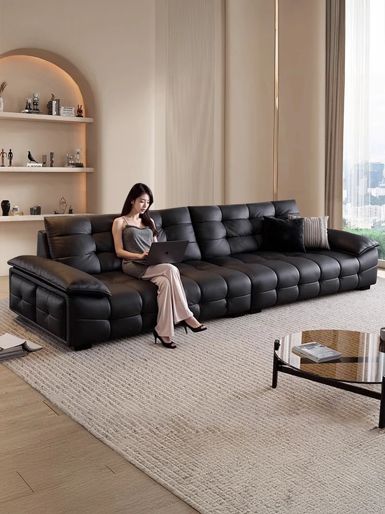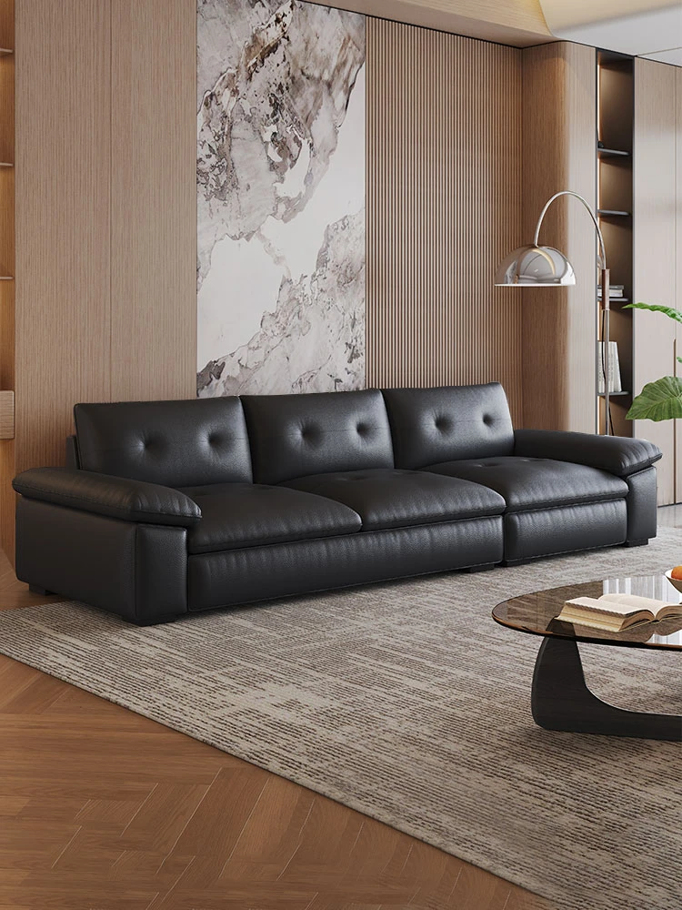 イタリアンミニマリズムのローレンス大黒熊本革ソファ - モダンでシンプルなデザイン、洗練されたブラックのストレートライン、リッチな軽奢感が漂うリビングルームに最適な一品!