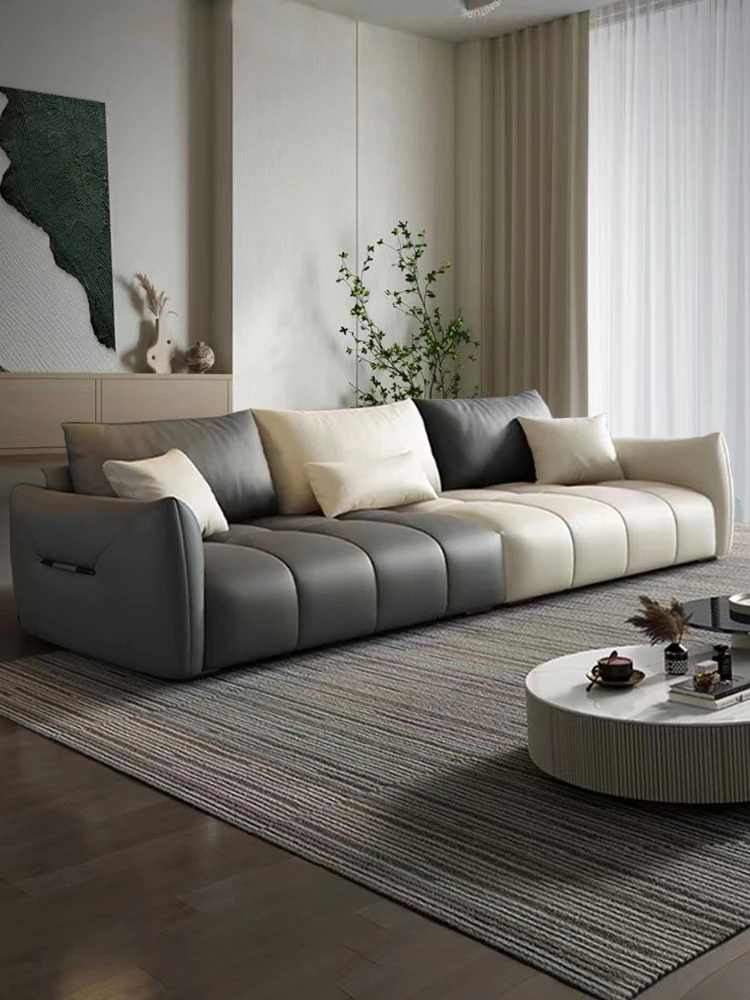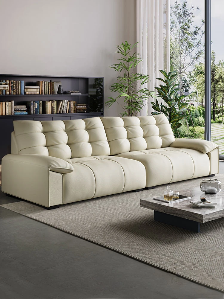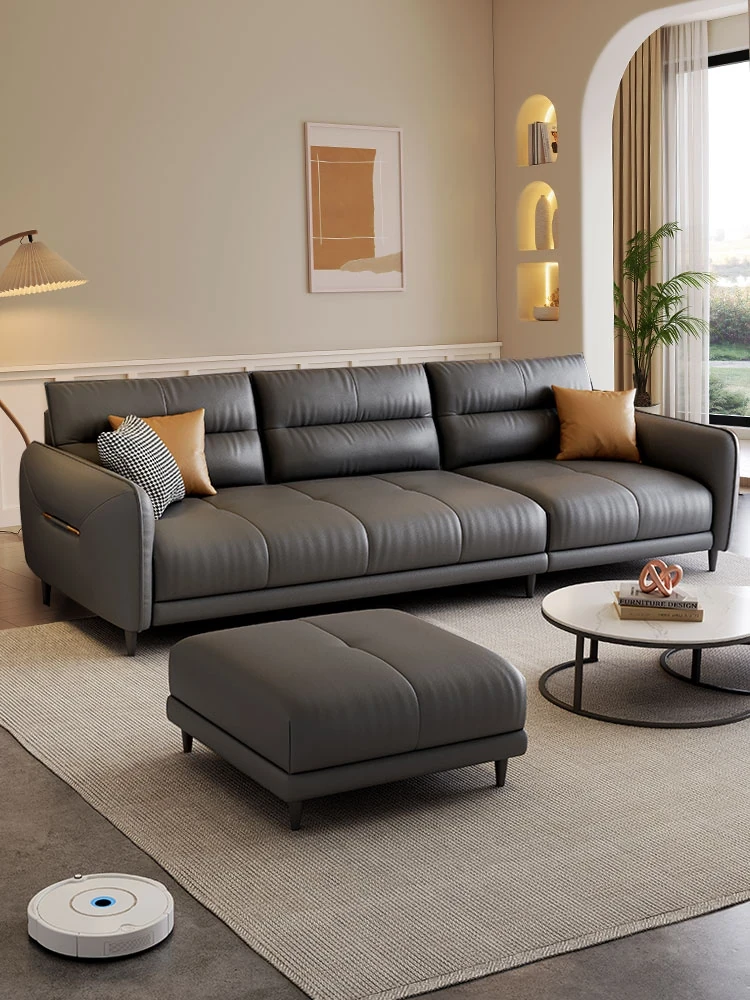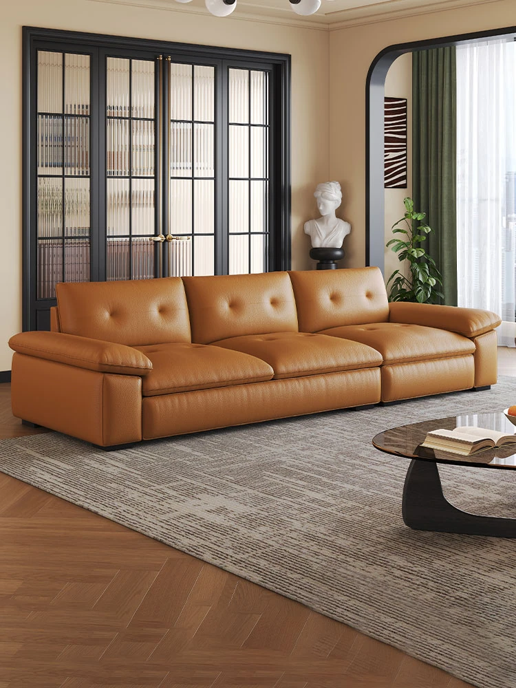軽やかなラグジュアリーが魅力!イタリアンシンプルデザインの本革ソファ - モダンでミニマル、狭い家でもぴったりのストレートスタイル。レトロなオイルワックス仕上げの牛革ソファで、快適なリビング空間を演出します!