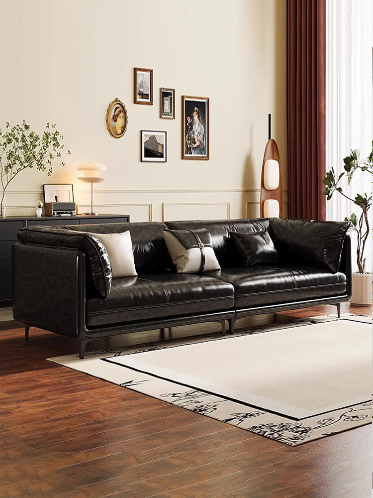 イタリアンミニマリズムの中古風レトロオイルワックス本革ソファ - 超深い座面と高い背もたれを備えた、家族でくつろげるブラックストレートデザイン!あなたのリビングルームに優雅さをプラスします。
