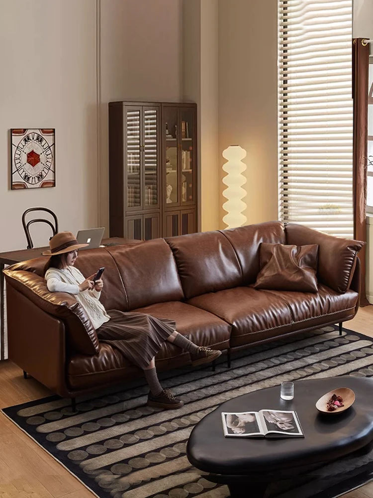 Elegant Italian-Style Top-Grain Leather Sofa - Modern Minimalist Living Room Straight Couch in Vintage Oil-Waxed Leather for Home Use