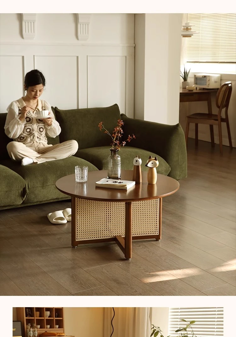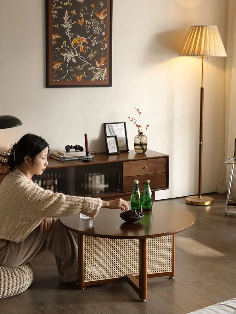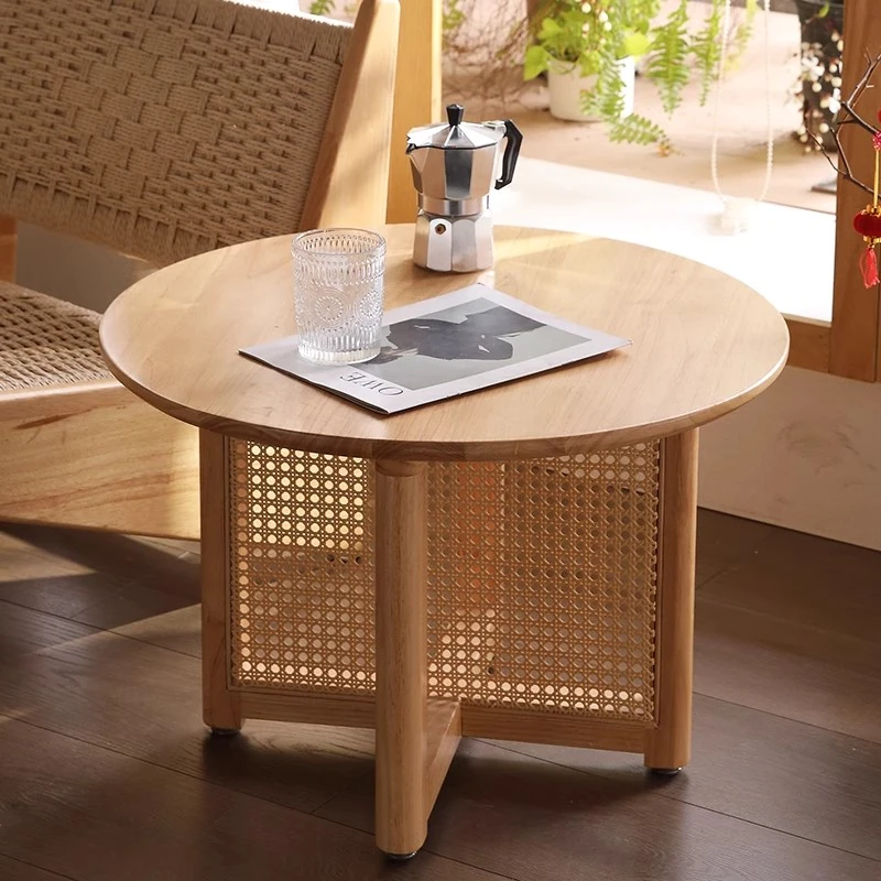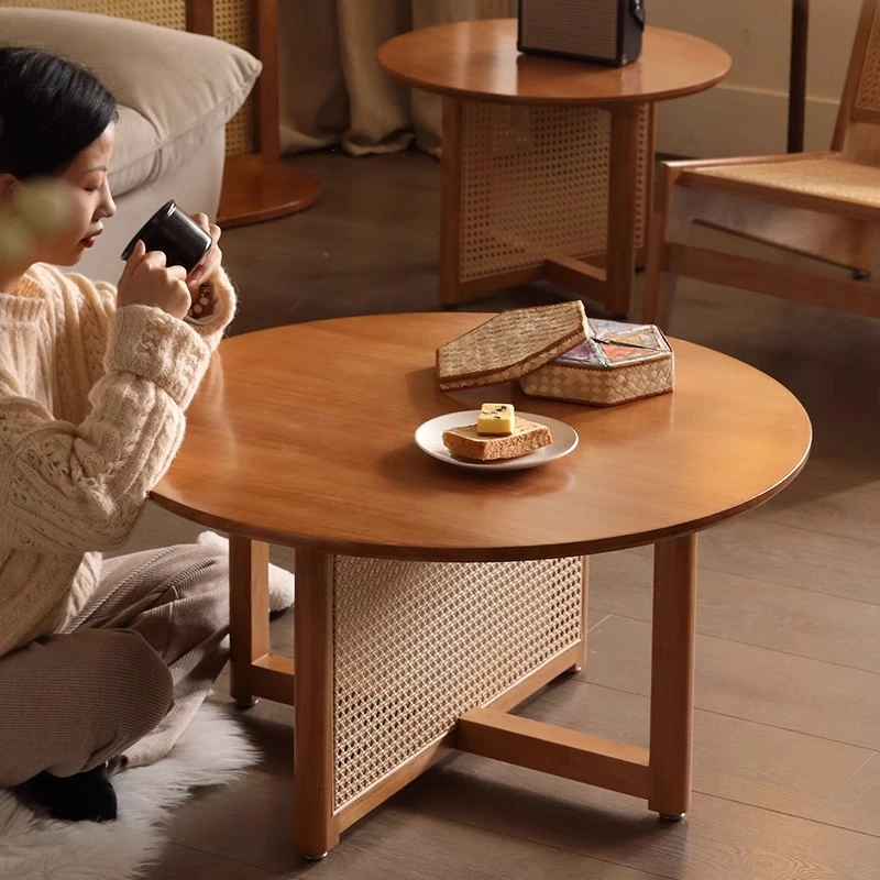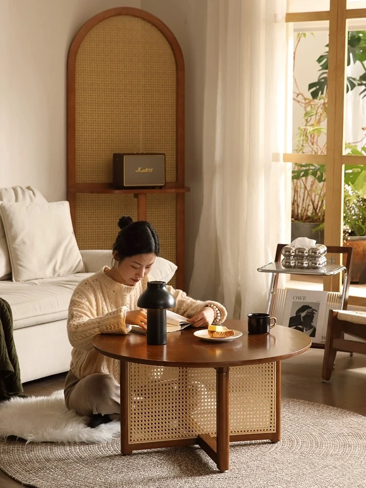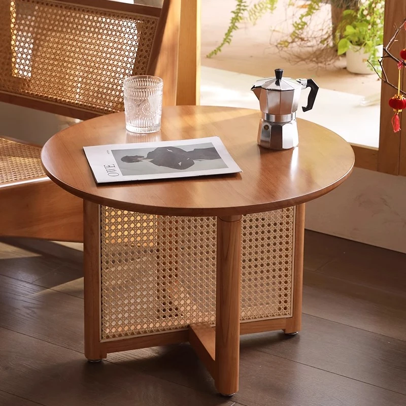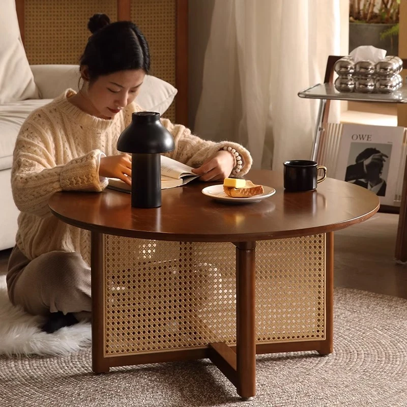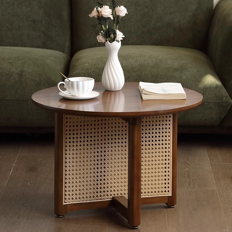 French Vintage Black Peach Solid Wood Round Coffee Table - Retro Style Rattan Side Table for Living Room and Balcony, Perfect for Home Use