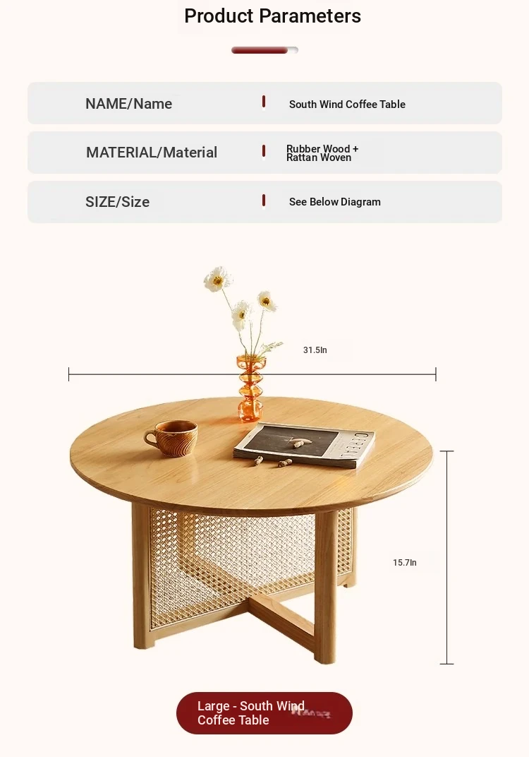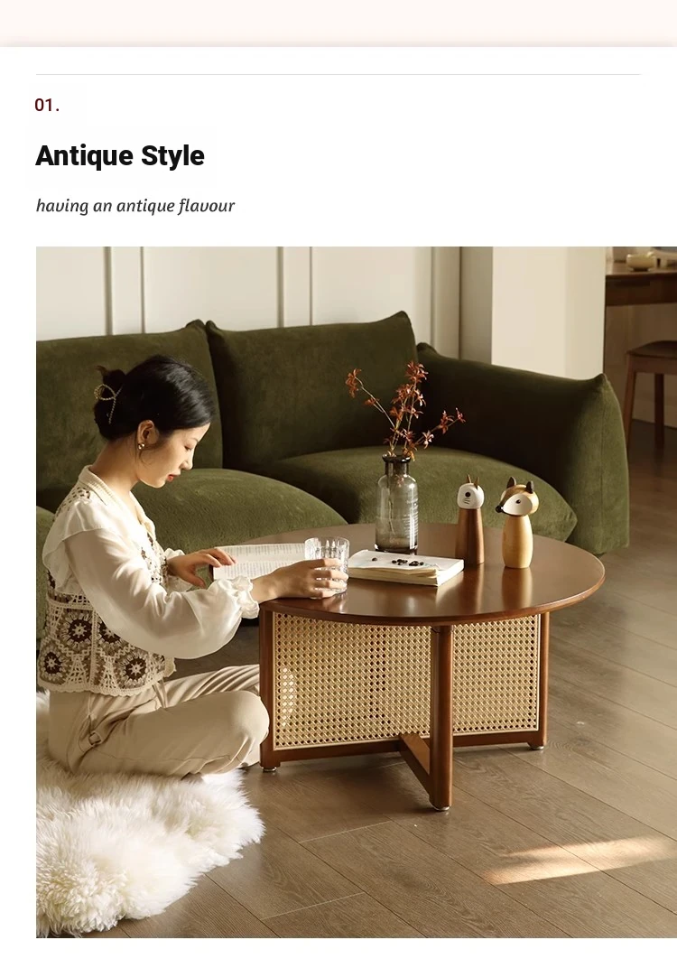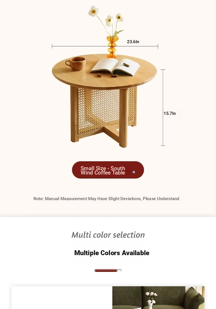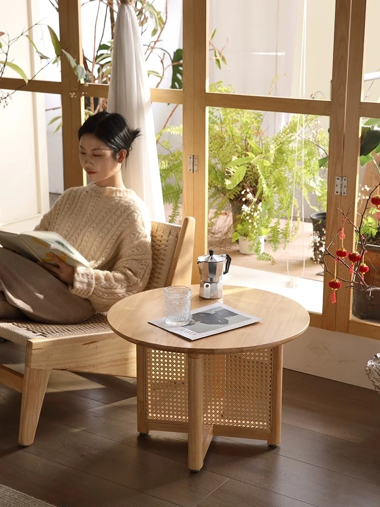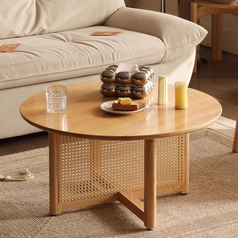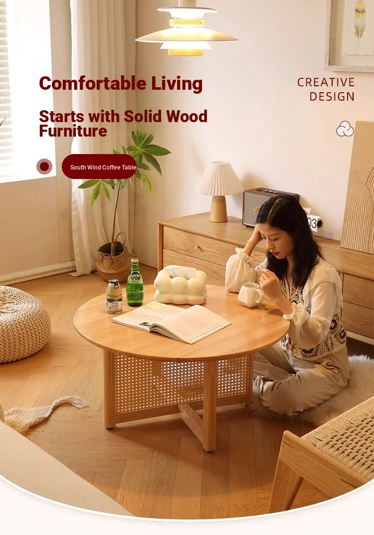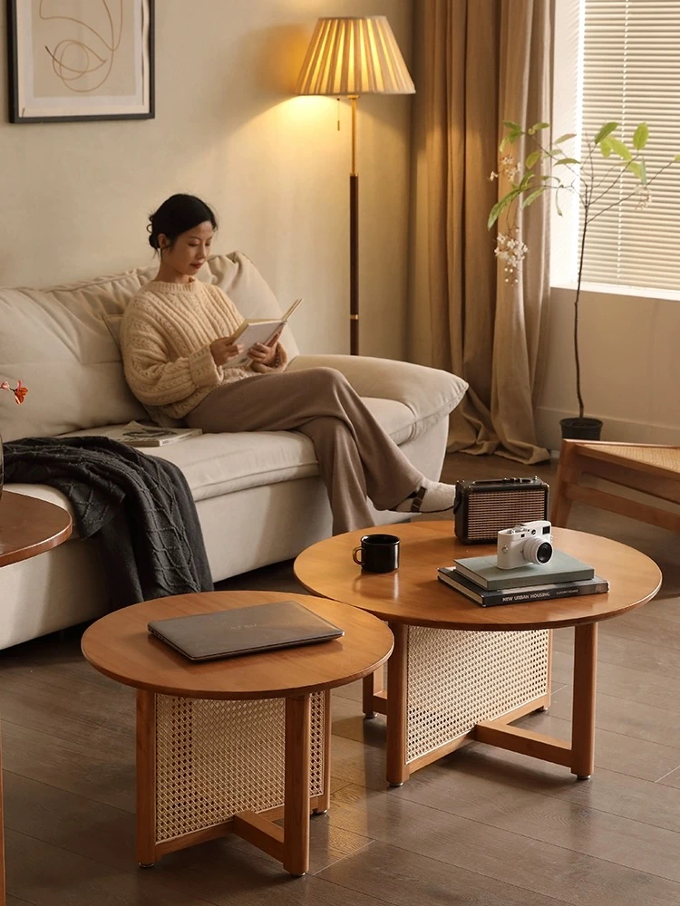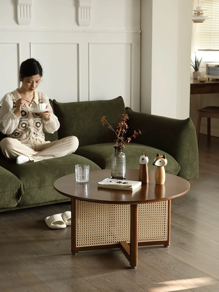 French Vintage Black Peach Solid Wood Round Coffee Table - Retro Style Rattan Side Table for Living Room and Balcony, Perfect for Home Use