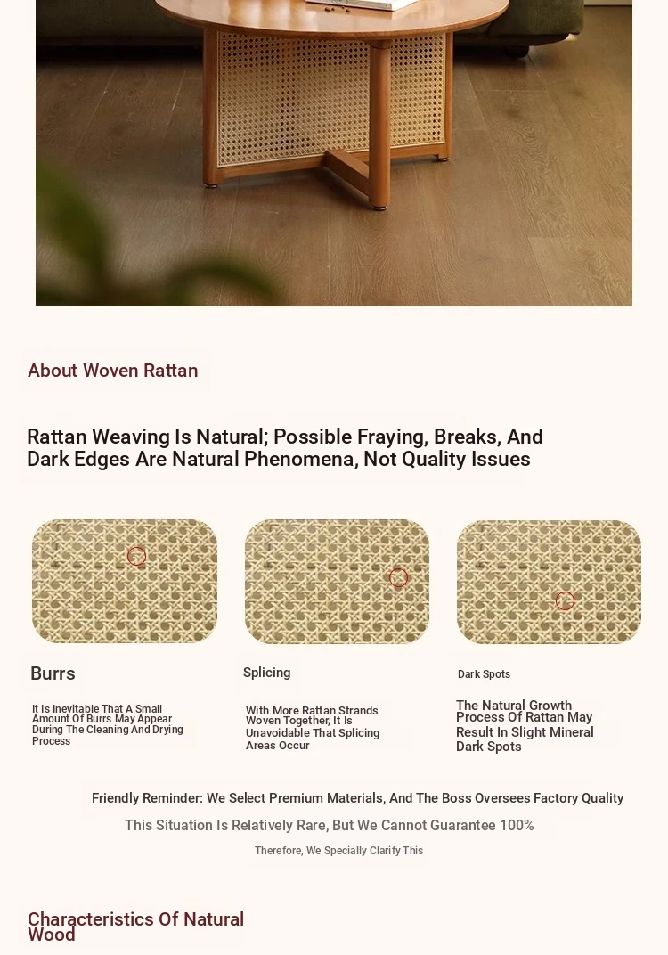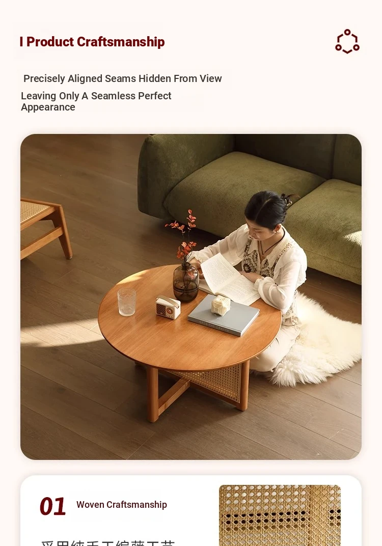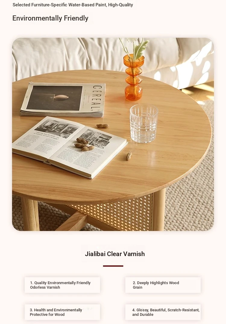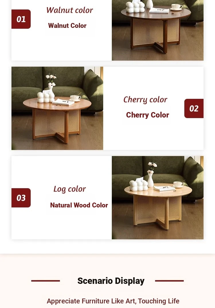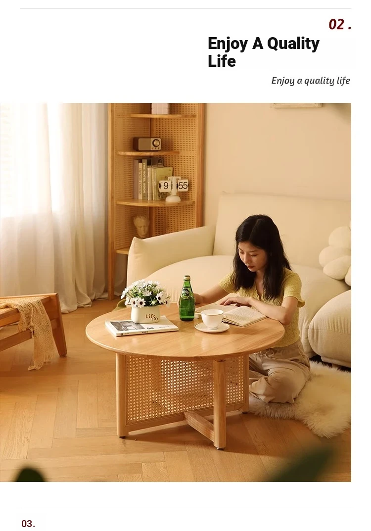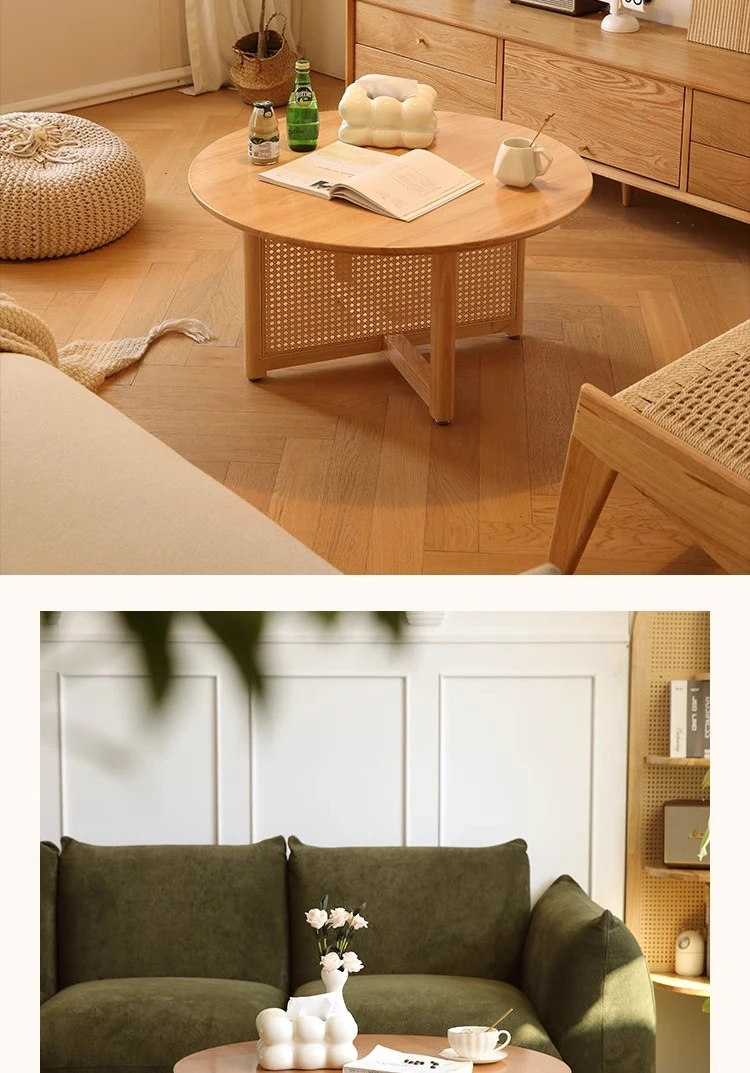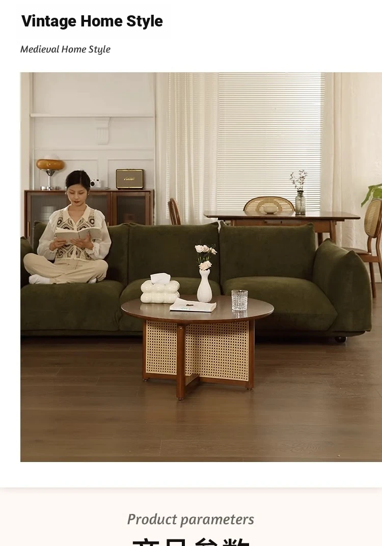 French Vintage Black Peach Solid Wood Round Coffee Table - Retro Style Rattan Side Table for Living Room and Balcony, Perfect for Home Use