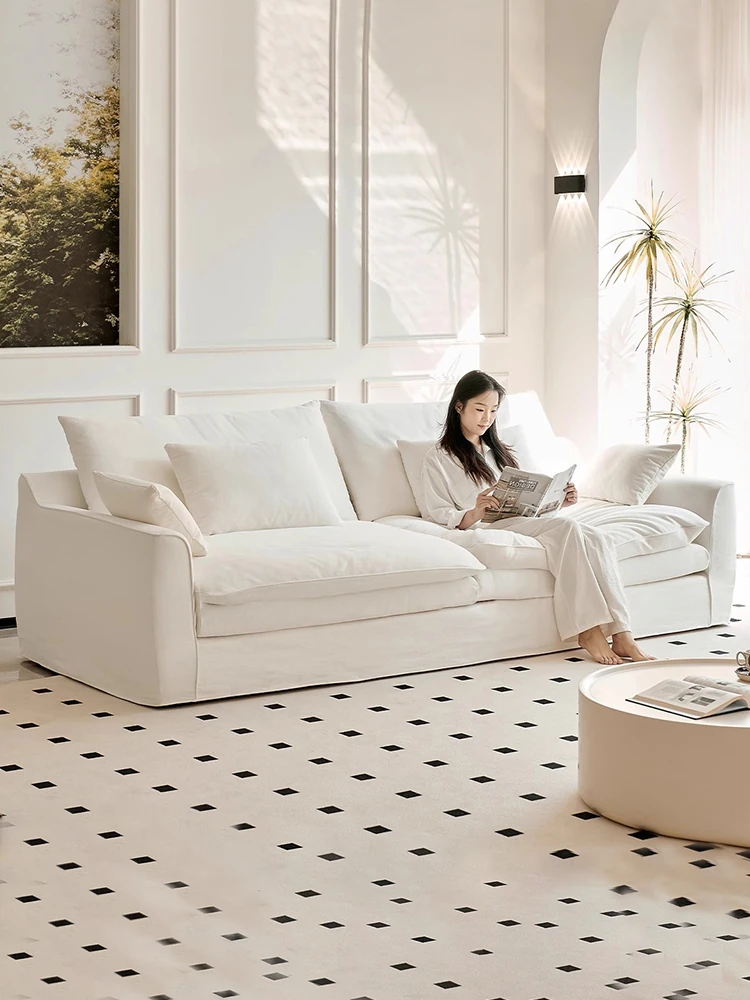 クリームカラーのリネン布製ソファ フランス風 モダンミニマリストデザイン 大小兼用 リアルダックダウン使用のヒヤシンスソファで、あなたのリビングを優雅に演出!
